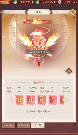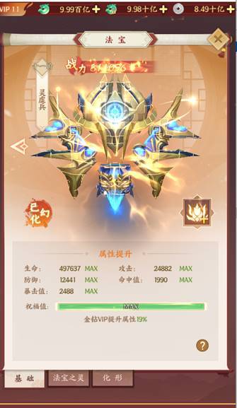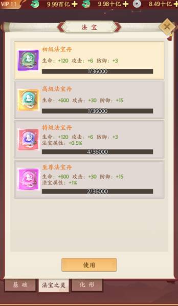 通过界面的法宝按钮,点击一下就能打开法宝界面了,在界面中可以看到属性加成数值。培养法宝进阶可以大幅提升这些属性值,以及解锁更多技能或更绚丽的外观。